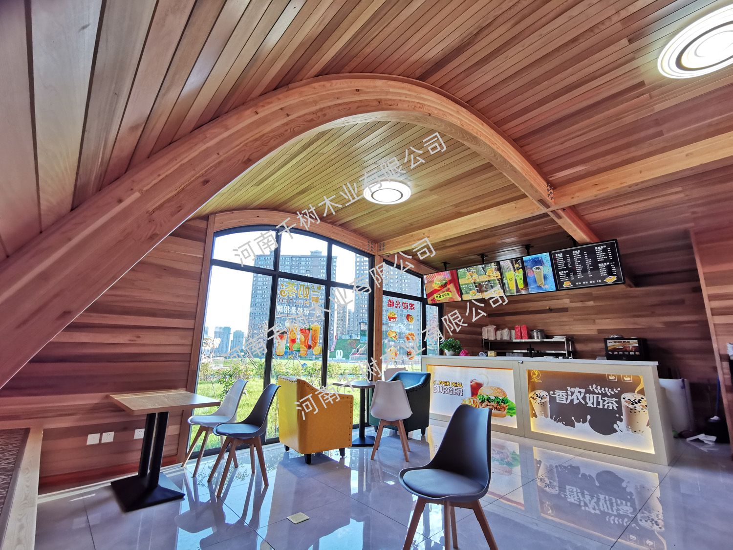項目介紹:木屋定制。采用紅雪松無節(jié)外飾面
