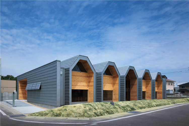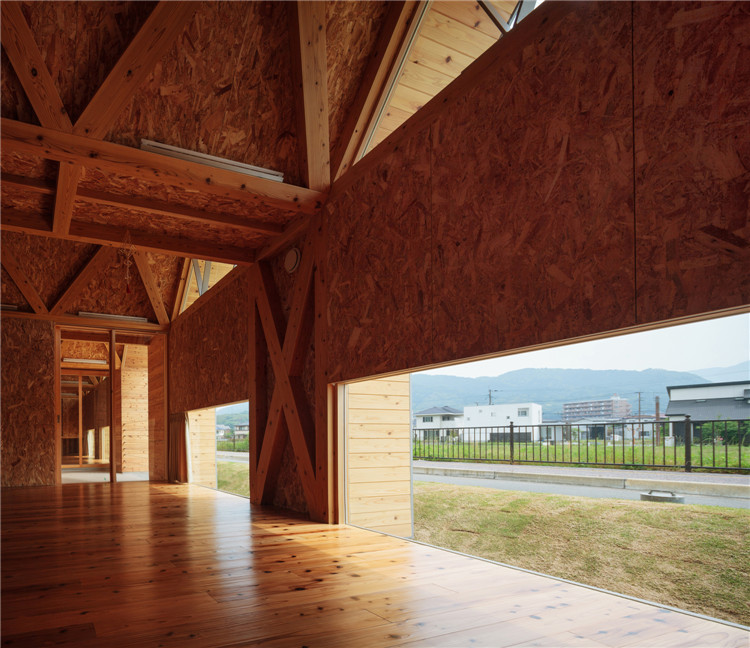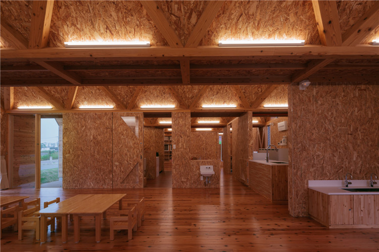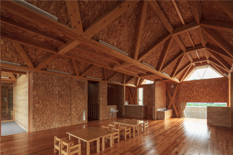 本案托兒所位于福岡市附近的太宰府市,為了容納更多的孩子,不得不增加為兩個班級??紤]到日本全國范圍的出生率下降,不久的將來這里的孩子數(shù)量可能會減少,因此建筑師決定建造一座只有一室空間(9米跨度)的建筑,內(nèi)部沒有支柱,方便各種用途(游戲室等)的轉(zhuǎn)換。木桁架梁在工廠安裝,用拖車運送到施工現(xiàn)場。復雜的連接也是在工廠制作的,只有一個相對容易的連接在現(xiàn)場組裝。這樣的方式提高了施工精度,縮短了施工工期。