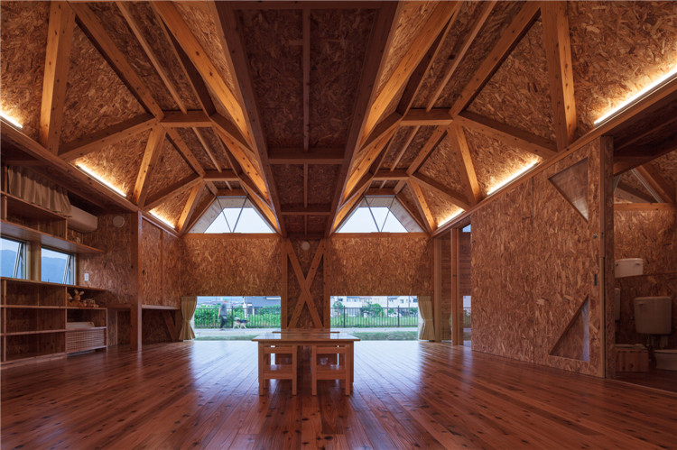 屋頂結(jié)構(gòu)采用折疊板設(shè)計,無柱空間是通過運用木桁架梁屋頂結(jié)構(gòu)實現(xiàn)的,形狀像一塊折疊板。所有支撐屋頂結(jié)構(gòu)的承重墻都被布置在建筑外圍?,F(xiàn)在這座建筑分成了兩個保育室、衛(wèi)生間等,但將來也可以轉(zhuǎn)換為一個大房間。