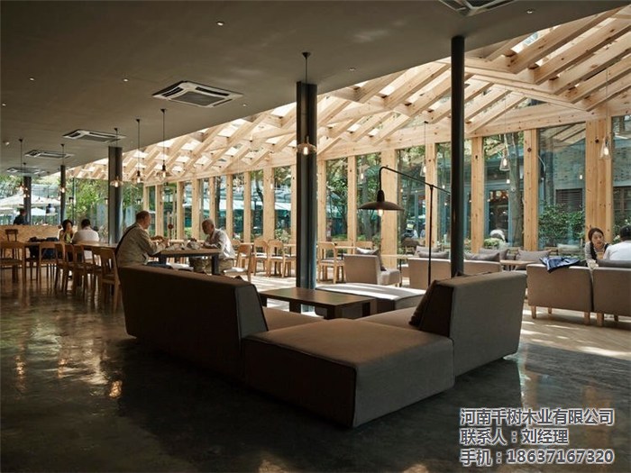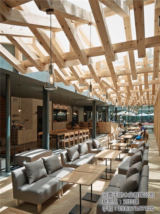 且新增的木梁在原有的鋼梁結(jié)構(gòu)之間交織穿梭,形成豐富有層次的光影效果,尤其是在天氣晴好的時(shí)候,體驗(yàn)感更為直接。對于空間區(qū)域的分割,設(shè)計(jì)團(tuán)隊(duì)也著手從天花板部分來創(chuàng)造。比如前述提到的主要的編織木梁結(jié)構(gòu),其下方的空間寬敞明亮,更適合于那些喜愛沐浴在陽光或自然天光之下的客人們。而靠近建筑內(nèi)部的空間,在灰黑色的天花板映襯之下,則要顯得沉穩(wěn)、私密一些,顯然更適合那些需要安靜空間的客人們。