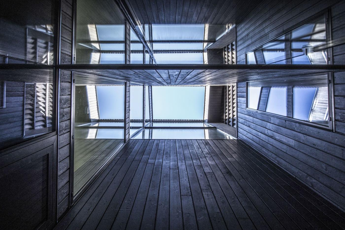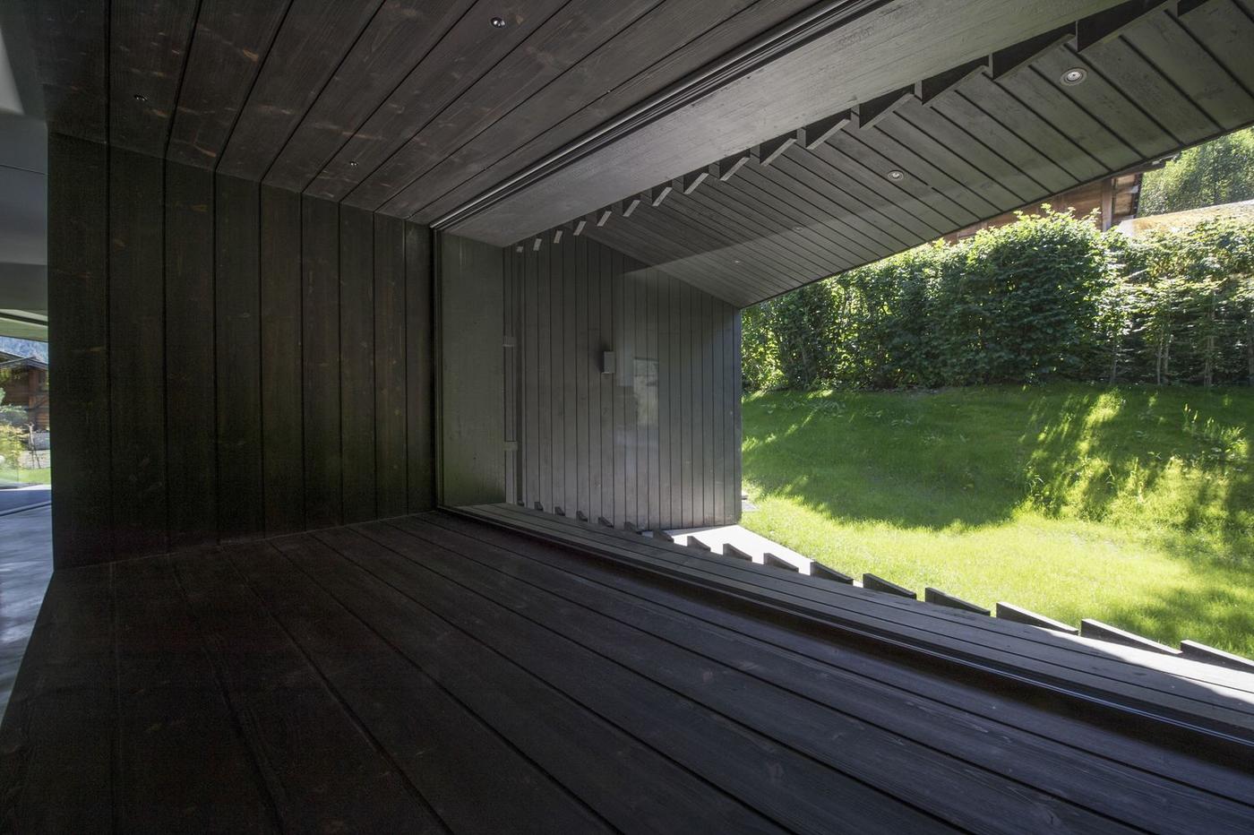 落葉松木板用于建筑主要外墻的百葉窗覆層系統(tǒng),以便保證地面層和2層的浴室擁有良好的視野。 用于外墻的落葉松木經(jīng)過特殊的加熱處理,以便保持顏色的持久并防止煙灰的附著。