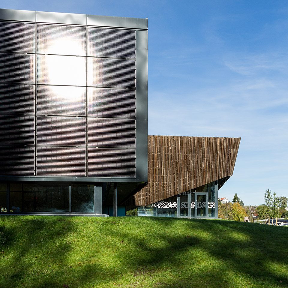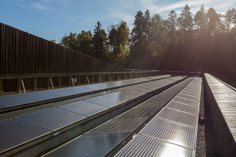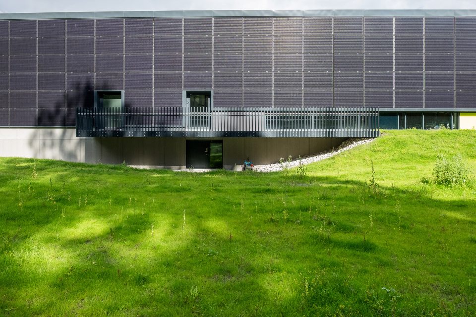 被動式的設(shè)計(jì)使建筑在能源利用方面變得更加高效,具體體現(xiàn)在建造方法、隔熱層和建筑形式上。除此之外,設(shè)計(jì)還強(qiáng)調(diào)了能源的再利用,其中以熱水供暖最為突出。650平方米的太陽能板和場地中的15個地?zé)峋餐瑢碜曰鶐r的熱能輸送給建筑,在夏季還能將多余的熱量傳遞到地表下方。