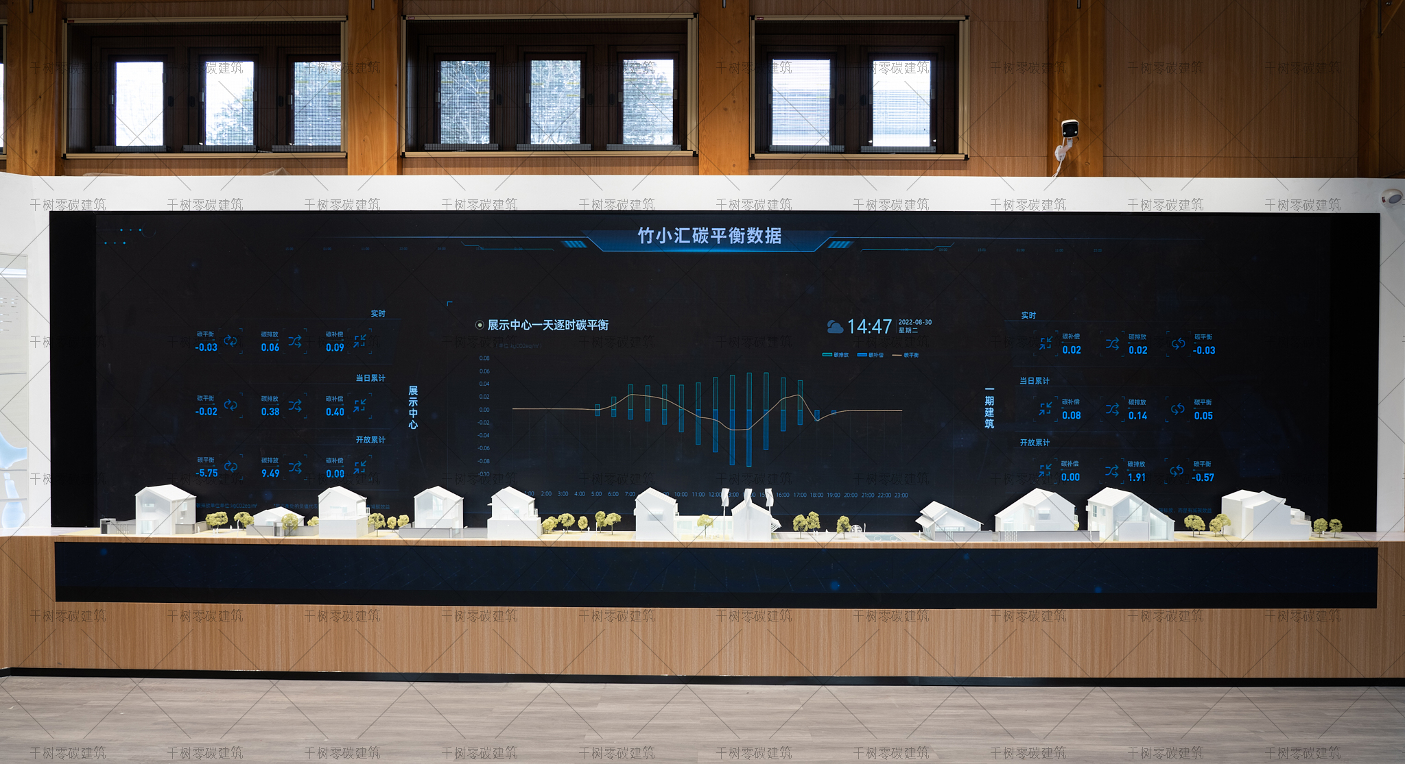 報(bào)告廳木屋和展示中心木屋墻面采用隔氣膜+內(nèi)外雙層保溫(內(nèi)保溫184mm厚,外保溫70mm厚)+CLT正交膠合木飾面板,屋面采用隔氣膜+保溫(屋面保溫235mm厚)+光伏瓦的圍護(hù)結(jié)構(gòu),門窗采用被動(dòng)式節(jié)能阻燃木門窗(內(nèi)置遮陽百葉),加上高能效的技術(shù)設(shè)備:地源熱泵系統(tǒng)、風(fēng)力發(fā)電系統(tǒng)、建筑光伏一體化系統(tǒng)、光儲(chǔ)直柔系統(tǒng)、熱回收系統(tǒng),通過可視化的智慧運(yùn)維管理平臺(tái)高效監(jiān)管、智慧運(yùn)算,綜合管控與整治,最終實(shí)現(xiàn)了零碳建筑的目標(biāo)。