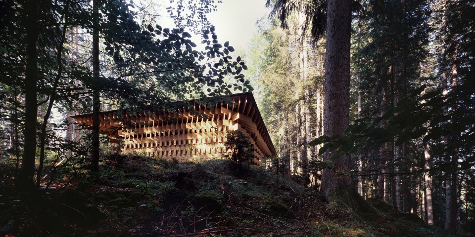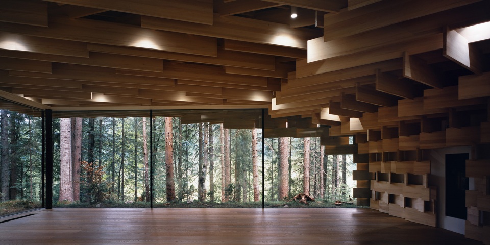 該建筑以生長在場(chǎng)地附近的冷杉樹為主要材料,3厘米寬的木板像樹枝一樣堆疊起來,在廣闊的森林和精致的建筑間形成一種柔和的過渡。小屋同樣也充當(dāng)了使人融入森林的媒介。陽光透過枝葉間的縫隙從天窗透進(jìn)室內(nèi),帶來森林中常??梢泽w驗(yàn)到的“komorebi”(木漏れ日)般的效果。