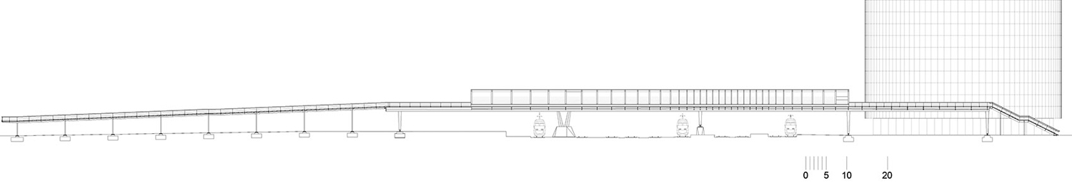 Dietmar Feichtinger建筑事務(wù)所在昂熱Saint-Laud火車站設(shè)計(jì)了一座新的橋梁,供行人和自行車使用。橋梁呈柔軟的弧線形,跨越總寬度達(dá)70米的一道道鐵軌,融入到城市的地形之中。橋面由中空箱體和鋼架組成,弧線西側(cè)整合有木制長(zhǎng)椅。項(xiàng)目整體優(yōu)雅而輕盈,將不同地區(qū)連接在一起。由膠合木梁組層面的框架支撐屋頂和照明系統(tǒng),呈現(xiàn)出驚人的效果,使橋梁成為一個(gè)吸睛的新地標(biāo)。橋的剖面不斷變化,形成動(dòng)態(tài)的空間,讓人們?cè)谶M(jìn)入、爬上樓梯、漫步、等待、坐下休息、觀看和離開等行為狀態(tài)下體會(huì)到不同的空間特點(diǎn)。項(xiàng)目為一個(gè)單體結(jié)構(gòu),尺度與所在區(qū)域相呼應(yīng),施工精美,提升了人們對(duì)該區(qū)域的關(guān)注度?;⌒谓Y(jié)構(gòu)讓橋面可以緩慢抬升,連接新建的Place Giffard-Lagenvin散步道和另一側(cè)的公園。三臺(tái)電梯和樓梯在車站、酒店,以及開往巴黎和南特的火車站臺(tái)之間創(chuàng)造了無障礙連接,方便騎自行車的人使用。橋梁外形美觀,展現(xiàn)了改造后車站地區(qū)的新樣貌。