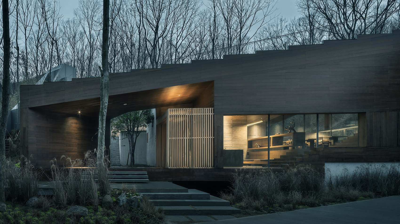 這是在杭州郊區(qū)山林里的一個休閑度假服務(wù)空間,設(shè)計是從具體的環(huán)境開始的,我們首先要思考的是做一個什么樣的空間裝置可以和這片山林對話,可以更好的順應(yīng)地形并融入這片自然,場地的特殊條件決定了建筑的特殊性。