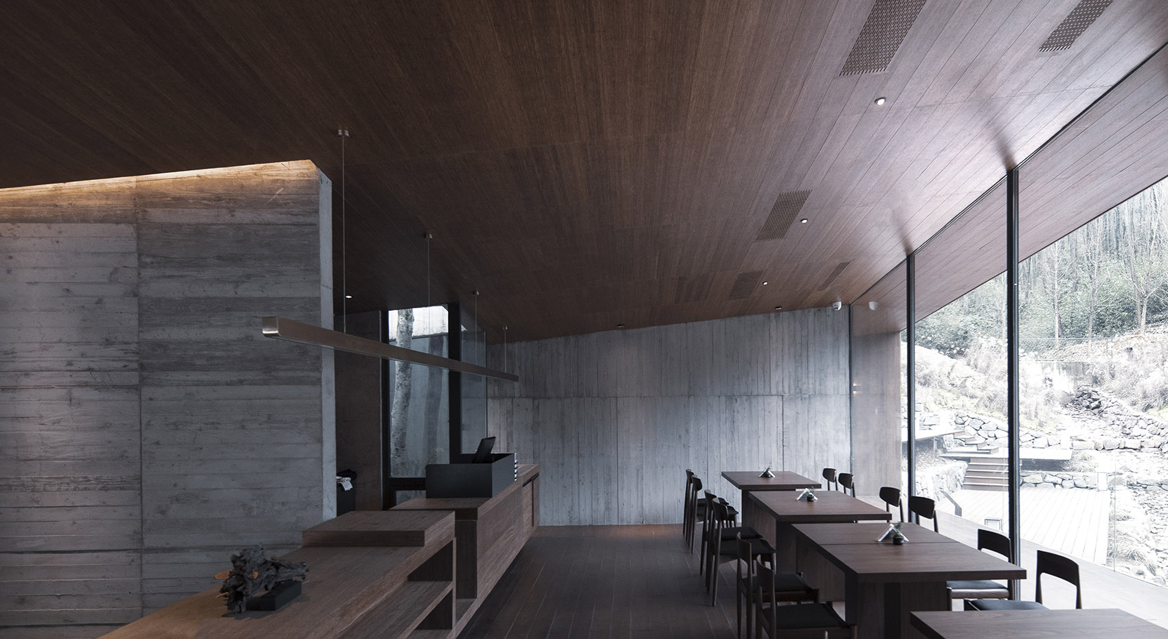 建筑的另外兩側(cè)分別嵌入山體之中,架空的蝶狀建筑的下方仍然保留了溪水和山路的通道。為了將部分樹木保留在室內(nèi),豎向結(jié)構(gòu)被設(shè)計成“柱院”,結(jié)構(gòu)意義上是柱子,空間意義上,是保留了一棵樹的“微院”。屋面是一個臺階狀的坡屋頂,可作為小型演出的森林劇場,室內(nèi)空間被這個大坡屋頂統(tǒng)一起來,并因為不同地面標(biāo)高的變化而富有節(jié)奏。