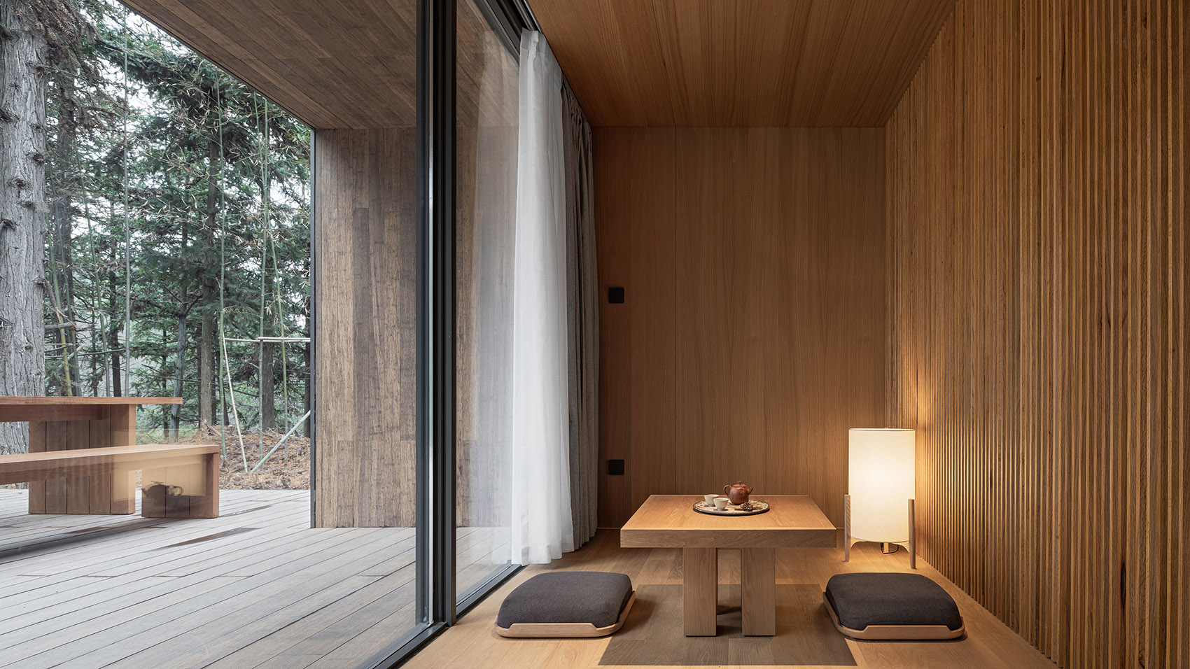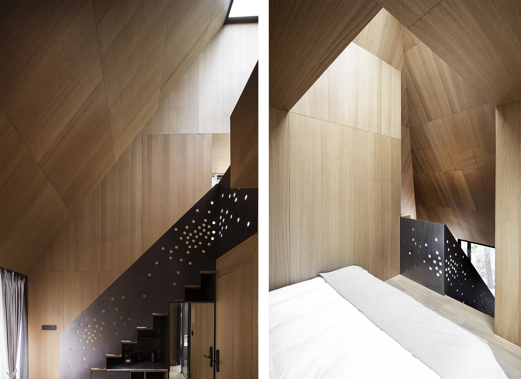 每個小屋中都保留了一棵場地原生的樹木,樹木所占據(jù)的空間成了屋中院,透過玻璃時刻于室內(nèi)生活相伴,是自然向建筑的反向滲透,屋中院也為室內(nèi)衛(wèi)生間提供了具有私密性的風(fēng)景。
