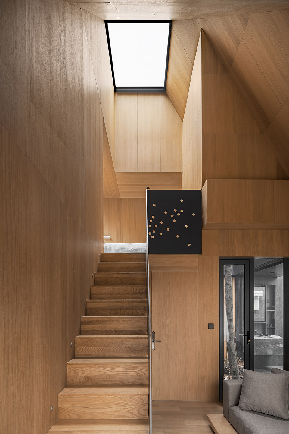 空間的大小是以人的基本尺度來定義的,建筑的墻面和屋頂都觸手可及,這種微小的尺度讓人時刻感受到建筑處于自然之中。這種接近于野營帳篷的空間體驗,希望讓人時刻感受到自然就近在咫尺,只是隔了一層外墻的厚度。通體的木質(zhì)材料提供了溫暖而舒適的建筑內(nèi)襯,給人提供了舒適而愜意的生活氛圍,這和外部自然的野趣形成的強烈的反差,這種反差讓人對自然保持敏感,更能感受到自然之美,或溫柔細(xì)膩,或爆裂冷峻。