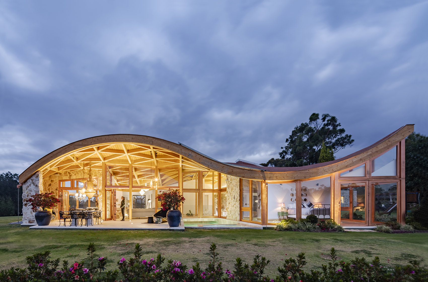 主要空間如臥室、客廳、餐廳,以及廚房等都朝向周圍景觀開放,預(yù)制的疊合梁使波浪形的屋頂成為可能,創(chuàng)造出有趣的視覺效果,同時在建筑與環(huán)境之間創(chuàng)造出共生的關(guān)系。起伏的山脈便是波浪形梁的靈感來源。